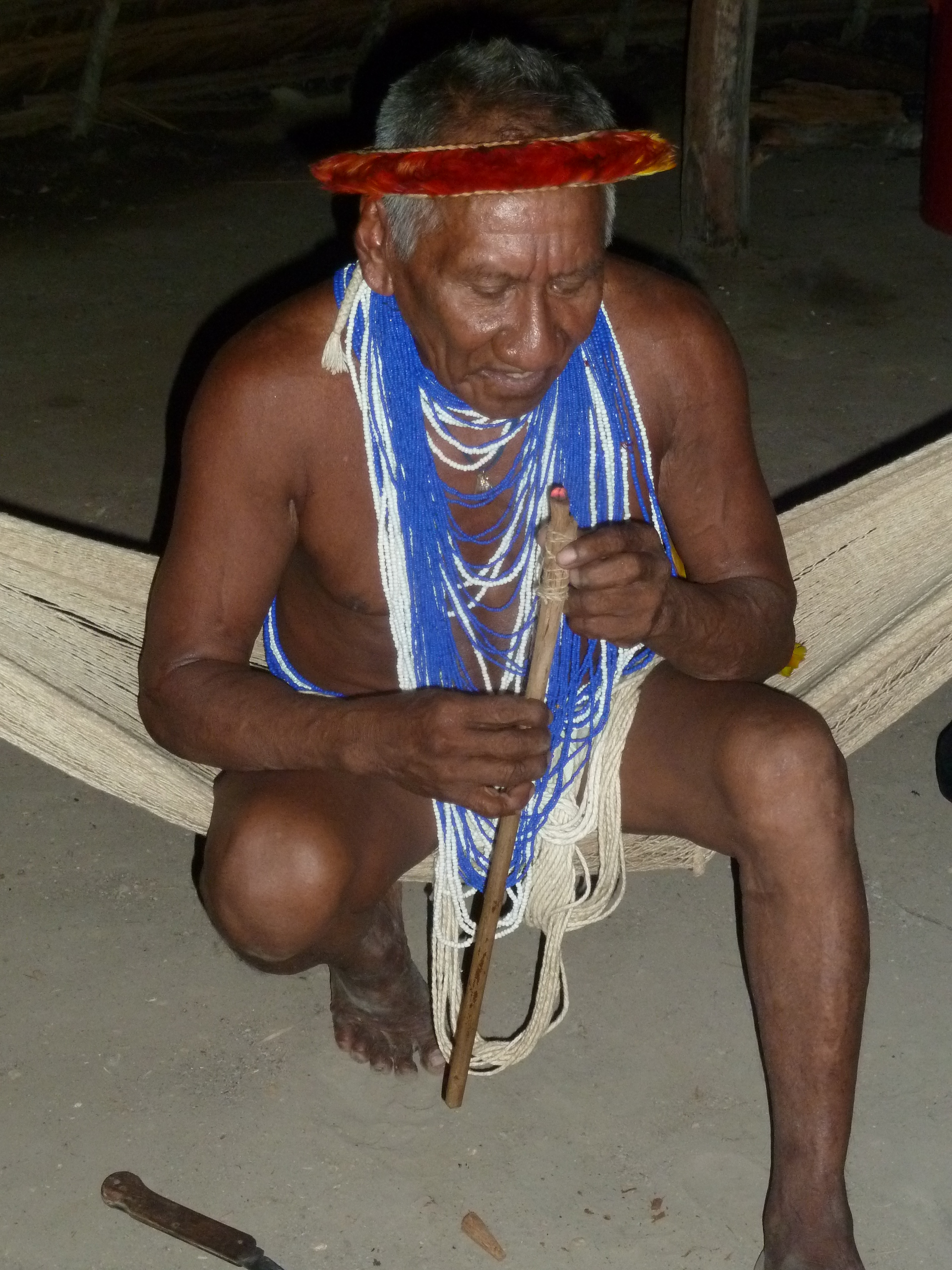 Nos reciben con una ceremonia “típica” donde el “cacique” tocó su flauta y hasta prendió fuego frotando leña. Se adornaba con plumas exóticas y collares.