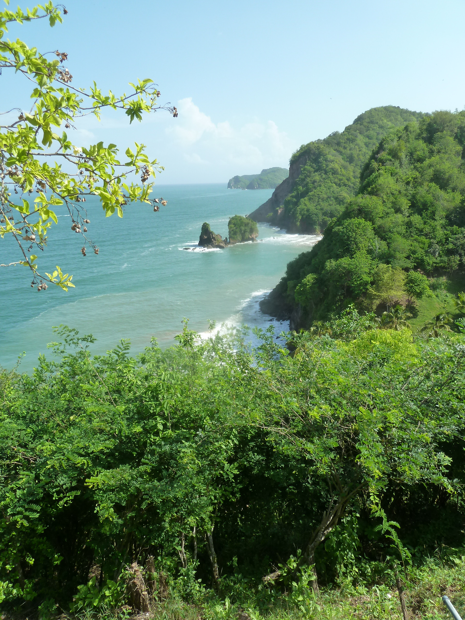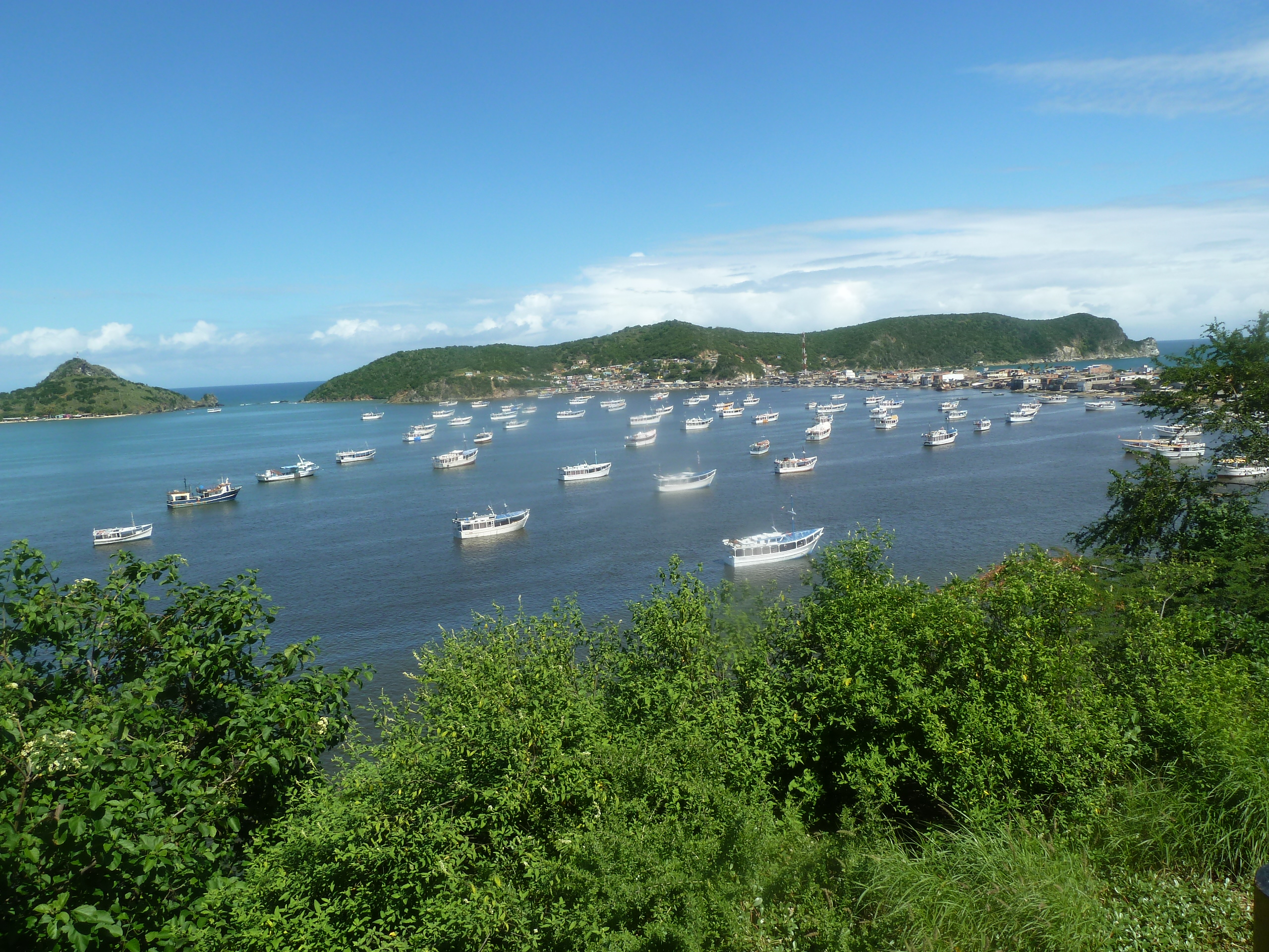 Puerto Santo; nos anuncia la proximidad de Río Caribe; una vista encimada de una bahía enclavada con barcos de pesca.