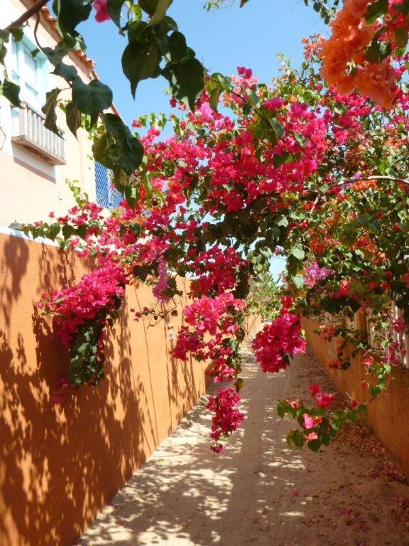 La playa está a distancia a pie. Basta pasar por un Arco de Triunfo de vivaces trinitarias para colmarse. Uno es atendido en churuatas de palma…con bebidas…. y hasta un taquito de almuerzo: pan pita, tomate y mozzarella derretido.