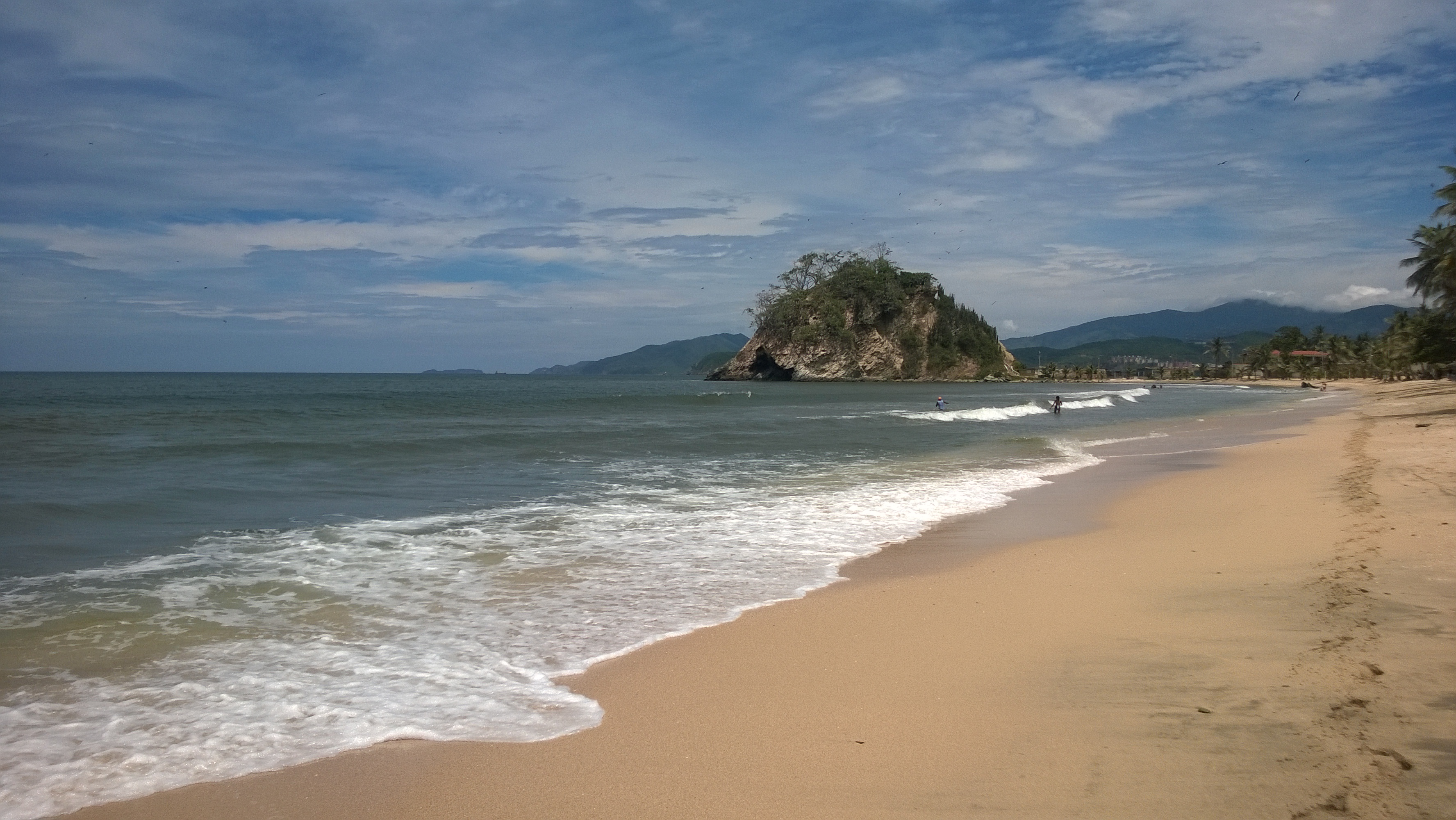 Playa Medina es una bahía paradisiaca, sobresaliente en lo natural y en sus servicios. La carretera desde Carúpano nos lleva en una hora y está en muy buenas condiciones. Hay cocoteros de punta a punta, aguas esmeraldas en los extremos donde la selva se zambulle y azul en el medio de la bahía. El agua es fresquita. La brisa acaricia en la orilla y se ausenta a los pocos metros. Lo más meritorio es que la comunidad organizada tomo el control hace unos años y su labor se nota. Hasta la grama se ha extendido debajo de la sombra. El pago del estacionamiento cubre el manejo de la basura y mucho más. Hay baños, kioskos y servicio a la mesa. El almuerzo es carite o pargo, con arepa, ensalada y tostón. Las conservas de la playa pasean en las cestas de Eulogia, la señora que adorna su cabellera con una cachupina rosa. Nos ofrece gustosa cacao con plátano y piña con coco.