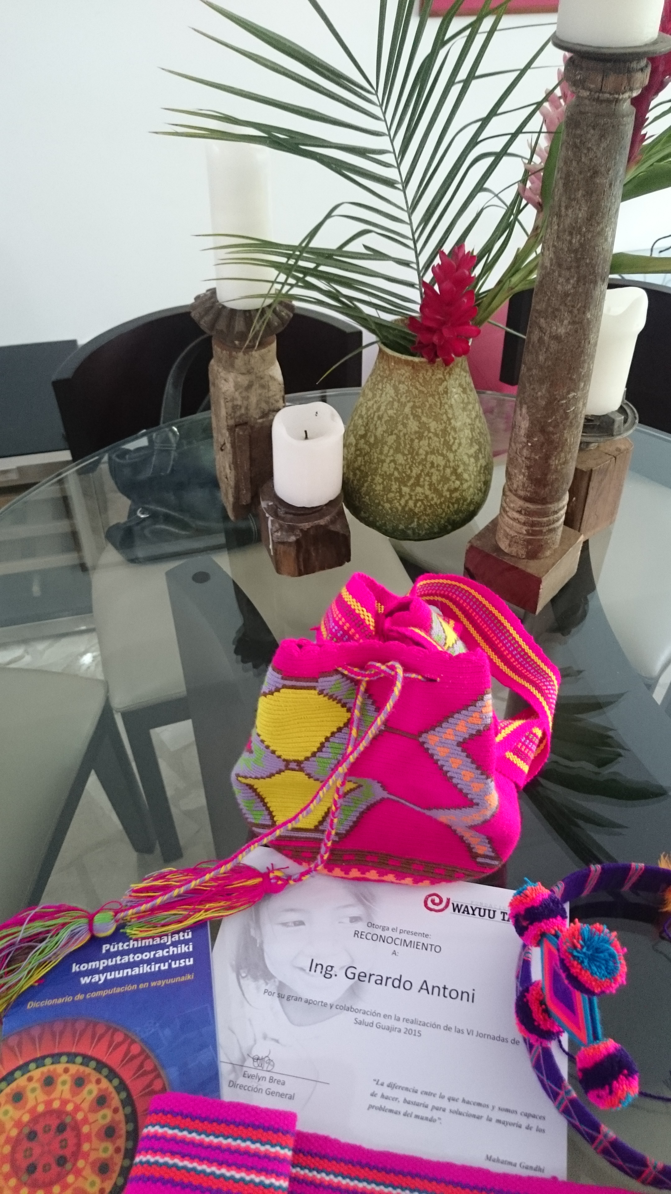 Regreso a plenitud, y como siempre con simbolismos que reposan en la “gAtonera” para que la vista a su paso devuelva la vivencia una y otra vez. Un Bolso Susu (mochila tradicional tejida en vivos colores), un cinto, una manta y hasta una Corona Wayuu; la cual es utilizada en ocasiones especiales y por personas especiales. La cultura Wayúu debe ser preservada con todo su simbolismo. Es una sociedad matriarcal, con habilidades artesanales públicas y notorias. Tienen una manera singular de administrar justicia, que trasciende los gobiernos de los “arijunas”; los que no pertenecemos a ninguna etnia. Una costumbre muy común y singular es “el encierro”, un ritual ancestral por medio del cual una niña se convierte en mujer. Usualmente son encerradas en soledad durante “12 lunas” o más. En una primera etapa solo pueden ser visitadas por mujeres de la familia. Al presentarse la menstruación la madre o abuela le enseñan los quehaceres del hogar, y se le inculcan valores. Al finalizar el encierro es presentada en sociedad. Asimismo la muerte, con sus dos velorios y entierros. Fascinante, al igual que el trabajo que nos queda por hacer. ¡Gracias Fundación Wayúu Taya por esta experiencia trascendente y marcadora!, y sobre todo su trayectoria en pro de las comunidades más vulnerables.